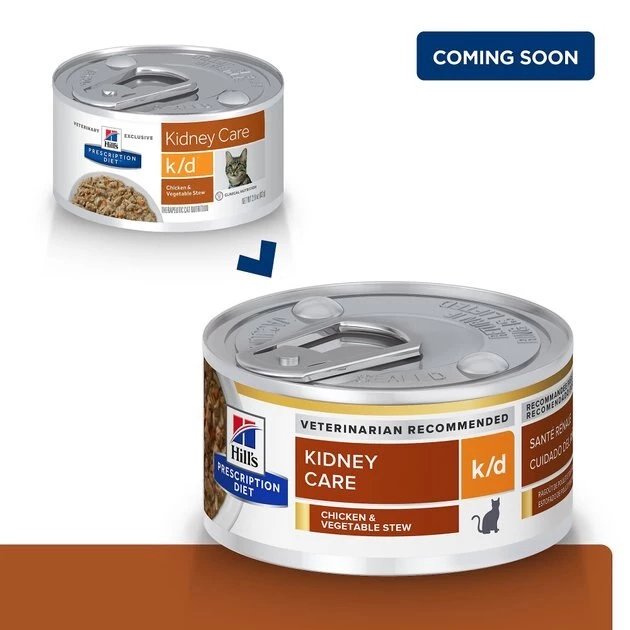 Kidneys are important because they remove waste substances from the blood, and maintain the normal balance of fluid and minerals within the body. Once kidney damage occurs, the consequences are usually irreversible. Hill’s nutritionists and veterinarians developed Prescription Diet k/d, clinical nutrition especially formulated to support your cat’s kidney health. In fact, k/d is clinically tested nutrition to improve and lengthen quality of life. This irresistible food makes it easier for you to bond with your pet with gently cooked, bite-sized chunks of real chicken and natural ingredients with added vitamins and minerals.