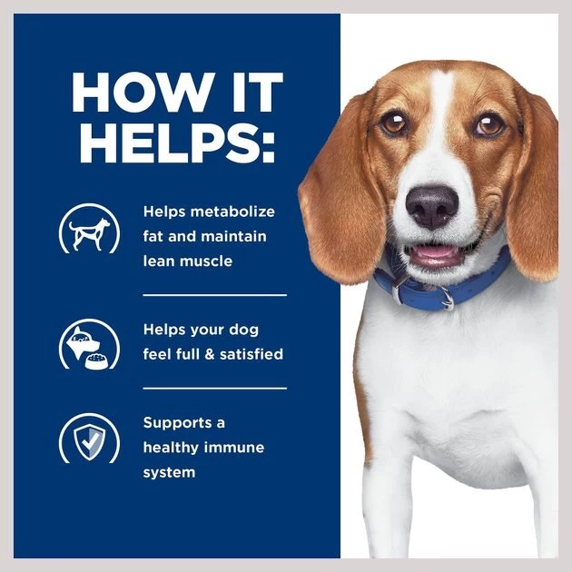 Almost 50% of the pet population is overweight. Even a little extra weight can lead to serious health problems. Extra weight can reduce play time, impact mobility and affect the general health of your dog. Factors contributing to weight gain include age, lack of exercise and overfeeding. Many commercial pet foods are loaded with salt and fat, which improve the taste but also have dramatic effects on your dog’s weight and overall health. Along with frequent physical exercise, choosing the right food plays a very important role in helping dogs reach their proper weight. At Hill’s, nutritionists and veterinarians have developed clinical nutrition especially formulated to reduce dogs’ body fat by 22% in two months, while keeping him or her satisfied.