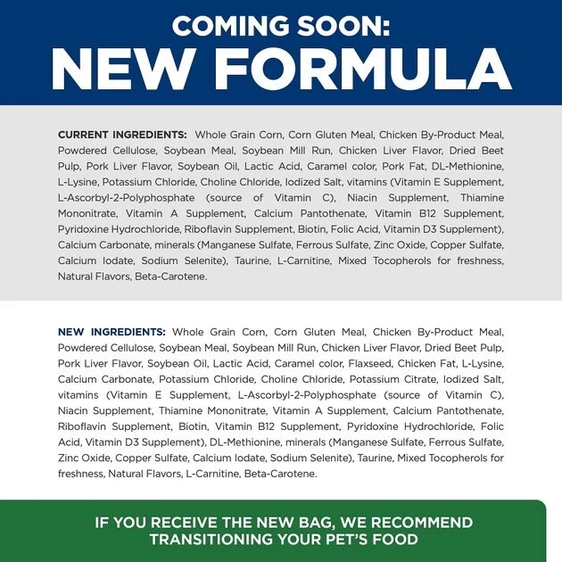 Whole Grain Corn, Corn Gluten Meal, Chicken By-Product Meal, Powdered Cellulose, Soybean Meal, Soybean Mill Run, Chicken Liver Flavor, Dried Beet Pulp, Pork Liver Flavor, Soybean Oil, Lactic Acid, Caramel color, Flaxseed, Chicken Fat, L-Lysine, Calcium Carbonate, Potassium Chloride, Choline Chloride, Potassium Citrate, Iodized Salt, vitamins (Vitamin E Supplement, L-Ascorbyl-2-Polyphosphate (source of Vitamin C), Niacin Supplement, Thiamine Mononitrate, Vitamin A Supplement, Calcium Pantothenate, Riboflavin Supplement, Biotin, Vitamin B12 Supplement, Pyridoxine Hydrochloride, Folic Acid, Vitamin D3 Supplement), DL-Methionine, minerals (Manganese Sulfate, Ferrous Sulfate, Zinc Oxide, Copper Sulfate, Calcium Iodate, Sodium Selenite), Taurine, Mixed Tocopherols for freshness, Natural Flavors, L-Carnitine, Beta-Carotene.