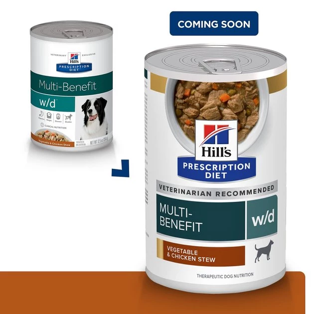 Some dogs are more prone to weight gain than others, but even a little extra weight can impact your dog’s quality of life. Hill’s Prescription Diet w/d Multi-Benefit Digestive/Weight/Glucose/Urinary Management is clinically tested nutrition specially formulated to support your dog’s weight management. This irresistible food has gently cooked, bite-sized chunks of real chicken and natural ingredients with added vitamins and minerals. Using therapeutic L-carnitine levels and an optimal blend of soluble and insoluble fiber, this delicious formula helps dogs with weight, digestive and glucose management.