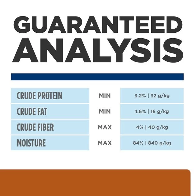 Water, Pork Liver, Carrots, Rice, Powdered Cellulose, Green Peas, Corn Starch, Chicken, Hydrolyzed Chicken Flavor, Soybean Oil, Potassium Alginate, Wheat Gluten, Chicken Fat, Calcium Chloride, Guar Gum, Dicalcium Phosphate, Monosodium Phosphate, Calcium Lactate, Calcium Gluconate, Potassium Citrate, vitamins (Vitamin E Supplement, L-Ascorbyl-2-Polyphosphate (source of Vitamin C), Thiamine Mononitrate, Pyridoxine Hydrochloride, Niacin Supplement, Calcium Pantothenate, Vitamin B12 Supplement, Biotin, Riboflavin Supplement, Vitamin D3 Supplement, Folic Acid), Choline Chloride, L-Lysine, L-Threonine, Taurine, Magnesium Oxide, minerals (Zinc Oxide, Ferrous Sulfate, Manganese Sulfate, Copper Sulfate, Calcium Iodate), L-Carnitine, Beta-Carotene.