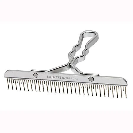 The Sullivan Supply Aluminum Handle Blunt Tooth Fluffer Farm Animal Comb balances strength with just a little bend for an ideal grooming tool. Itโs ideal for use on thick-haired cattle, since its short teeth pop out long guard hairs and prevent the lines that you might see using a skiptooth comb. The larger-diameter teeth have rounded tips for gentle combing. This comb isnโt brittle to cause breakage, and each tooth is individually placed by hand. Instead of using glue, which can dissolve when exposed to water and adhesive removers, the comb blades are crimp pressed to create a secure hold. This makes for a top-quality, durable comb that will become a must-have in your grooming kit.