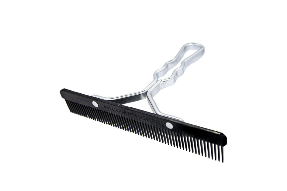 Revitalize your farmyard friend’s combing routine with Sullivan Supply Stimulator Regular Aluminum Handle Farm Animal Comb. This comb features a stylish aluminum handle and plastic teeth that massages the skin, which increases blood flow and stimulates hair growth. The plastic teeth effectively glide through fur without kinking or matting, as can happen with steel combs. Additionally, they are safer for you to use and carry, as there is less chance of puncture with these synthetic teeth. The massaging action also encourages the production of natural oils, which are beneficial for overall skin and hair health. These teeth are narrow and flexible, which allows for even greater stimulation and increased beneficial airflow to the skin. While this comb is effective for grooming your farmyard friends, it is not suitable for grooming legs with adhesives.